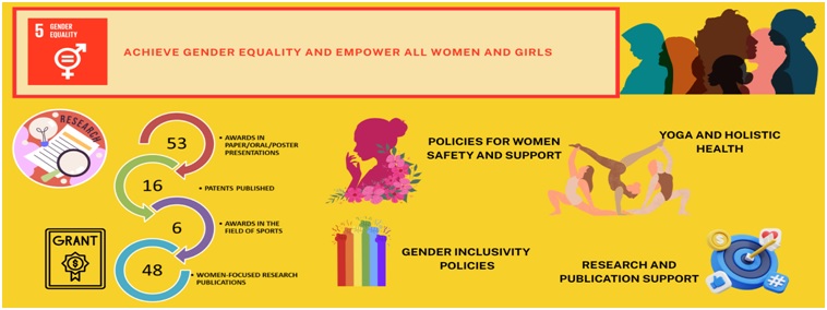 The Global Goals SDG 5 aims to achieve gender equality and empower allwomenandgirls.This goal is essential for ensuring that women and girls are offered equal rights and opportunities across all sectors of society.In a society where violence and injustice against women persist increasing women's leadership roles and investments in gender equality are crucial at national, regional, and global levels. Nitte University is a leading institution in promoting gender equality, with women comprising 66% of its student body and 72% of its workforce.The university has implemented various initiatives to ensure a safe and empowering environment for women, including surveillance systems, free transportation, counseling services, and day-care centers.Women hold significant leadership positions within the university, such as Deputy Registrar and Director of staff Development.Additionally, Nitte University supports women's professional growth through research funding and empowerment programs.