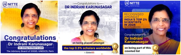 - Dr IndraniKarunasagar, Director Projects & NUTECwas invited to join the Advisory Board of IDSSD, UNESCO, Paris as a representative of herself and Nitte University.She was placed amongst the top 0.5% scholars worldwide and also got featured in Scholar GPS for her notable contributions in microbiology and various other disciplines andrecognized among the Stanford / Elsevier Top 2% Scientists Lists 2024 in the field of microbiology.