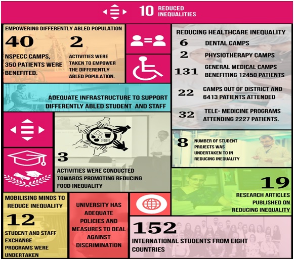 Nitte (Deemed to be University) has undertaken several proactive initiatives aligned with Sustainable Development Goal 10 (Reduced Inequalities) to promote inclusion, equity, and equal opportunities. The university ensures inclusive admission policies that support students from marginalized, rural, and underrepresented communities by offering reservations, scholarships, and fee waivers for economically disadvantaged groups, and minorities. Special emphasis is placed on supporting differently abled students through barrier-free infrastructure, assistive technologies, and academic counselling. Gender equity is promoted through an active Women’s Development Cell that organises empowerment programs, legal literacy sessions, and gender sensitisation workshops. Nitte also fosters cultural diversity through international student exchange programs and provides support systems for international learners. Community outreach is a core component, with regular health camps and educational initiatives conducted in rural, tribal, and coastal regions to address disparities in healthcare and education. The university maintains fair recruitment practices and has an Equal Opportunity Cell, SC/ST Cell, and Internal Complaints Committee to ensure non-discrimination and grievance redressal mechanisms. Nitte University collaborates with NGOs and academic partners to support research and projects that focus on reducing inequalities in health, education, and socio-economic status.