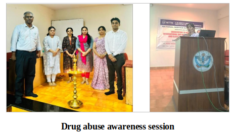 An orientation program was organized on July 5, 2024, for 1st BDS students at A. B. Shetty Memorial Institute of Dental Sciences. The program featured an insightful session by Dr. Kumuda Rao on the importance of community engagement in student life, followed by a guest lecture on “Substance Abuse and Management” delivered by Mrs. Reeti Rastogi, Clinical Psychologist, Yenepoya Medical College. With 38 participants, the program created awareness about the risks of drug abuse, encouraged responsible behavior, and reinforced the institution’s commitment to peace, justice, and student well-being.