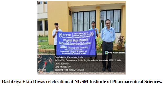The NGSM Institute of Pharmaceutical Sciences celebrated Rashtriya Ekta Diwas on 30th October 2024, commemorating the birth anniversary of Sardar Vallabhbhai Patel. Principal Prof. Dr. R. Narayana Charyulu highlighted Patel’s pivotal role in India’s unification and administered the National Unity pledge. The program actively engaged students and staff, promoting national integration, unity, and the institute’s commitment to fostering a cohesive and inclusive society.