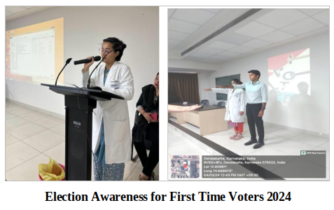 In association with the Electoral Literacy Club, Nitte DU, an “Election Awareness for First-Time Voters 2024” program was conducted on 2nd and 4th March 2024 to promote voter education ahead of the General Assembly Elections. The initiative featured informative sessions, voter pledge administration, and various competitions, all designed to empower first-time voters with a clear understanding of their rights and democratic responsibilities. The program reinforced the importance of active participation in the electoral process as a cornerstone of a vibrant democracy.