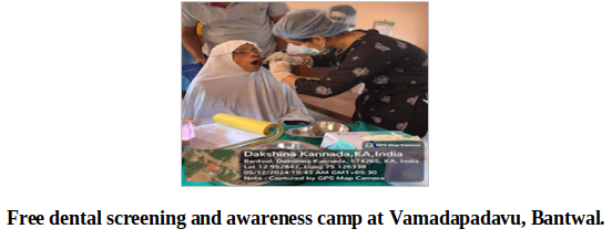 The Department of Public Health Dentistry, AB Shetty Memorial Institute of Dental Sciences, in collaboration with Sharada Seva Samithi Trust, Bantwal, organized a free dental treatment camp at Vamadapadavu, Bantwala on 12.05.2024. The programme aimed to provide oral health awareness and basic dental care to underserved rural populations. A total of 51 patients were screened. The initiative promoted equitable healthcare access and community well-being, fostering trust and strengthening institutional outreach in alignment with the values of peace, justice, and inclusivity.