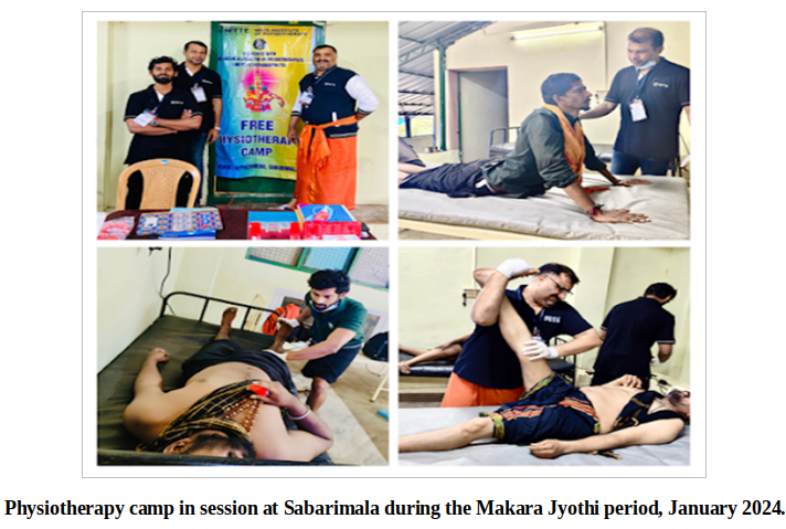 Nitte Institute of Physiotherapy, in collaboration with IAP Kerala and PRPC, organized a free physiotherapy camp at Sabarimala from 6th to 12th January 2024 during the Makara Jyothi period. The camp provided targeted physiotherapy care for Ayyappa devotees experiencing physical ailments while undertaking the barefoot pilgrimage, enhancing their comfort and mobility.