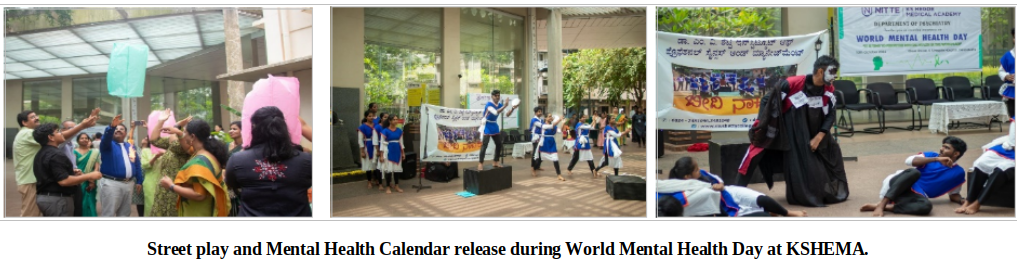 The Department of Psychiatry, KSHEMA, observed World Mental Health Day on October 10, 2024, at KS Hegde Hospital’s Glass House with the theme ‘Mental Health in the Workplace.’ Dr. MV Shetty College students performed a street play to raise awareness, and the annual Mental Health Calendar was released by dignitaries. Targeting healthcare professionals and students, the event promoted mental well-being, reduced stigma, and reinforced institutional commitment to creating supportive and inclusive environments.
