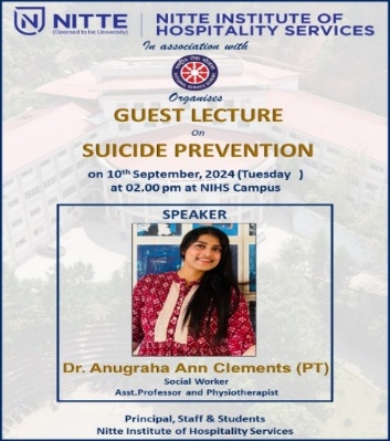 A guest lecture on “Suicide Prevention” was organized on 10th September 2024 at the NIHS campus. The session was delivered by Dr. Anugraha Ann Clements, Social Worker, with the objective of raising awareness about the signs, symptoms, and risk factors of suicidal thoughts and behaviors. Participants were guided on recognizing warning signs, seeking support through helplines and mental health professionals, and adopting effective coping strategies. The lecture emphasized early intervention, breaking the stigma surrounding mental health, and encouraging open conversations, thereby equipping students with the knowledge and confidence to provide timely and compassionate support to those at risk.