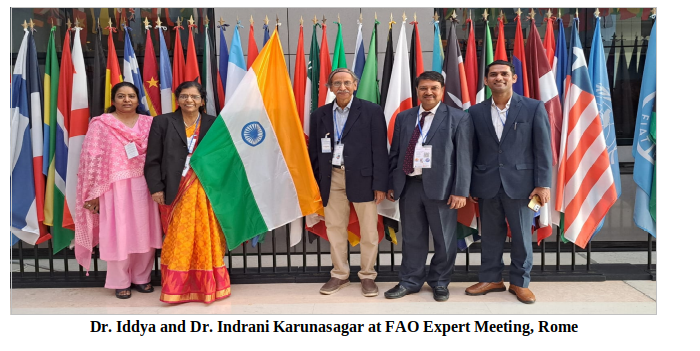 Dr. Iddya Karunasagar and Dr. Indrani Karunasagar participated in the FAO Expert Meeting on Fish-Vet+ Dialogue II: One Health and Biosecurity, and the International Conference on Aquatic Organism Health held in Rome, Italy, from 18–20 June 2024. Dr. Iddya Karunasagar spoke on ‘Foodborne AMR – optimizing genomic resources for mitigation,’ while Dr. Indrani Karunasagar moderated a session on One Health, AMR, zoonosis, fish safety, and welfare, and presented on ‘Oral nanovaccines against Aeromoniasis.’ The meetings were also attended by Dr. J.K. Jena, Deputy Director General, ICAR, and officials from the Ministry of Fisheries, Government of India.