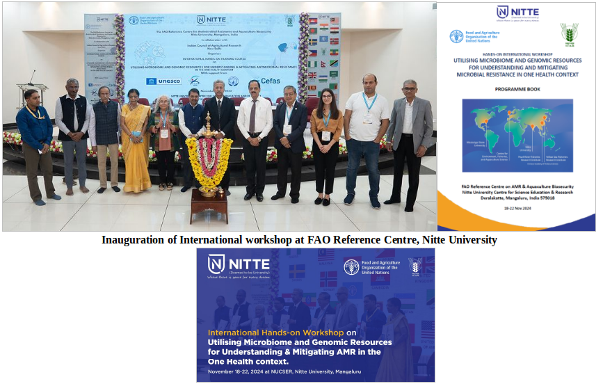 The FAO Reference Centre on AMR and Aquaculture Biosecurity at Nitte University, in collaboration with ICAR, organized an international hands-on workshop on “Utilising Microbiome and Genomic Resources for Understanding and Mitigating Antimicrobial Resistance (AMR) in One Health Context” from 18–22 November 2024 in Mangalore. The event, aligned with World Antimicrobial Resistance Awareness Week, brought together global experts from FAO, WHO, NACA, ICAR, MPEDA, and international reference laboratories. Sessions covered phenotypic testing challenges, development of epidemiological cutoff points, genetic determinants of AMR, and the use of microbiome, metagenomics, and whole genome sequencing tools for surveillance. Practical laboratory sessions provided training in antimicrobial susceptibility testing, genomic data analysis, and bioinformatics pipelines. The workshop emphasized the One Health approach, highlighting interlinkages between human, animal, and environmental health, and the need for coordinated AMR surveillance. It strengthened international collaboration while building capacity in low- and middle-income countries to develop evidence-based strategies for sustainable aquaculture and AMR mitigation.